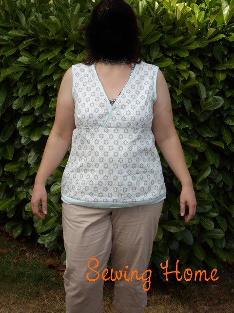 J'ai eu un pb de mensuration sur ce modèle. En effet, le 48 était trop grand et le 46 trop petit au niveau de la poitrine. J'ai donc biaisé en coupant dans un 48 sans marge de couture. Ce qui suivant ma logique, devrait donner un 46, mais allez savoir pourquoi, l'astuce a fonctionnée ! et pour la partie "basse", je suis restée sur un 46.